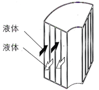 對于進(jìn)行換熱的兩種介質(zhì),如果都是液體,在螺旋板式換熱器的六道中是按螺旋方向流動的,如圖二,并且按逆流的方式流動,所謂逆流是指相鄰流道中兩種液體流動的方向相反,這樣能使兩流體在相互傳熱的流程中始終保持一定的溫差,從而可獲得較好的效果。