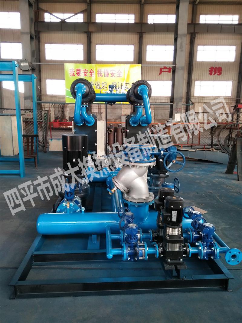 The automatic unattended on-site control heat exchanger unit has the function of manually controlling the heat exchanger unit. Besides, the primary network is equipped with an electric regulating valve, which controls the water supply temperature of the secondary network and has the function of outdoor temperature compensation. The circulating pump adopts frequency conversion control, and the water pressure difference of the secondary network is used as the feedback signal. The secondary network is controlled by variables, and the water pump is supplemented by frequency conversion. According to the water pressure difference of the secondary network, it is used as the feedback signal. All water pumps, electric regulating valves, water supply temperature of secondary network, etc. are fully controlled by the controller, and the controller can control the program to automatically start and stop the unit and restart it after power recovery. A water tank level sensor is connected to the controller to automatically control the water level of the water tank. But also has that function of wat shortage protection and water pump prevention; Secondary network return pipeline is equipped with loading and unloading pressure device. Under normal circumstances, the unit is in unattended and automatic operation state, and only the staff need to conduct regular inspections.